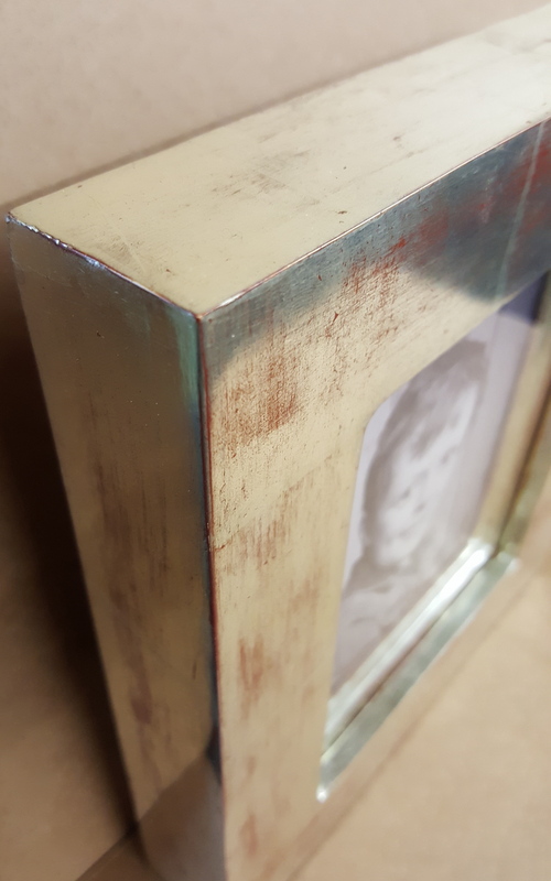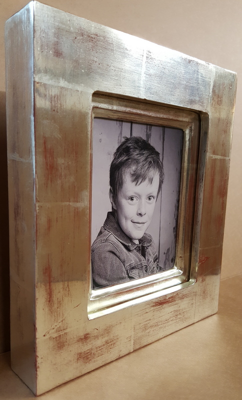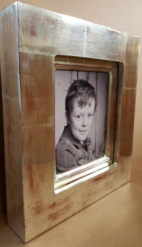 This photograph is framed in a ‘chunky block’ moulding which is gessoed, sanded and prepped for gilding. A red bole was added and then a 7,5 carat white gold. This was then burnished, to make it brighter, then rubbed back slightly to show the bole underneath.