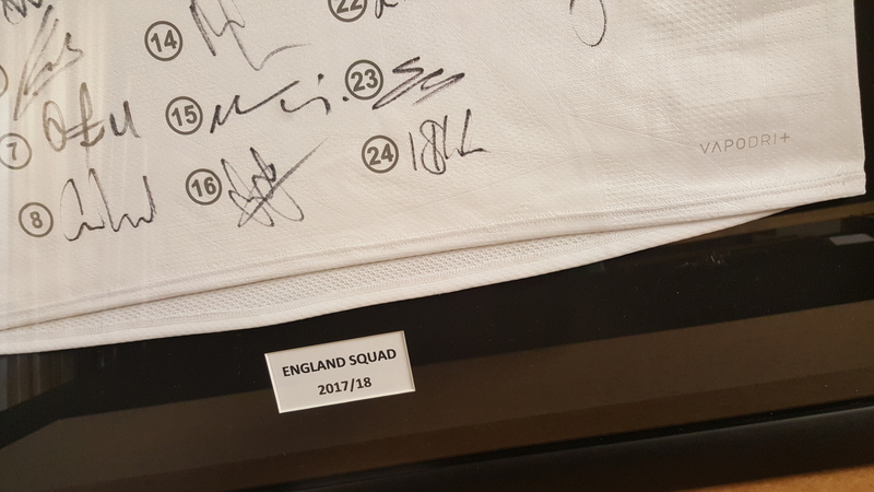 This England Rugby Shirt was signed by the full team and hand sewn to a conservation mountboard. A plaque was incorporated, a deep black frame with matching spacer to keep the items away from the AR70 non-reflective glass which helps to preserve the piece and reduce reflections.