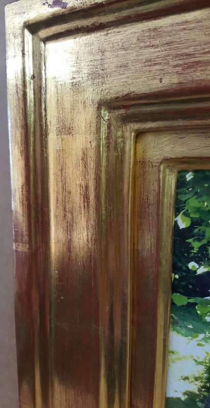 Venezia – 23 carat gold leaf. The gold is burnished and rubbed back to show the red bole underneath. We felt this really enhanced the very special photograph for our customer.
